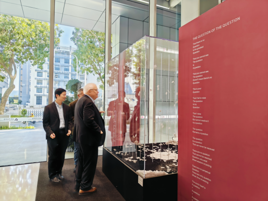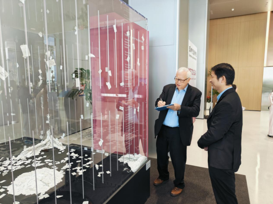 在参观过程中,Heckman教授对校园内一处名为“问题的问题”的科学艺术装置表现出浓厚兴趣。该装置以“问题风箱”为形态,汇集了来自人工智能、生命科学、物理学等学科的一万余个未解科学问题。纸条上的问题相互缠绕、彼此激发,以此激励学院师生以问题出发,勇闯科研无人区。Heckman教授也亲笔在纸条上写下自己的问题: