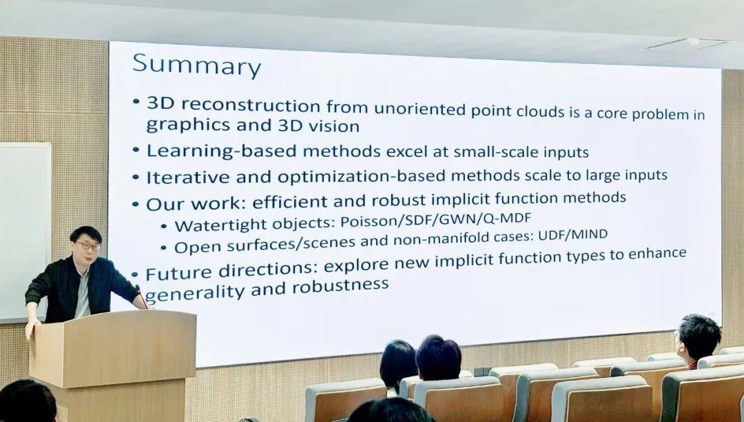 本次讲座系统梳理了点云重建的技术演进路径,重点介绍了贺英教授团队提出的迭代式泊松重建(IPSR)与扩散式重建(DWG)两大突破性工作,展示了如何通过统一迭代框架与并行计算优化,实现从无定向点云到高质量网格的稳定重建,并进一步探讨开放曲面、非流形结构与大规模场景重建等前沿方向。