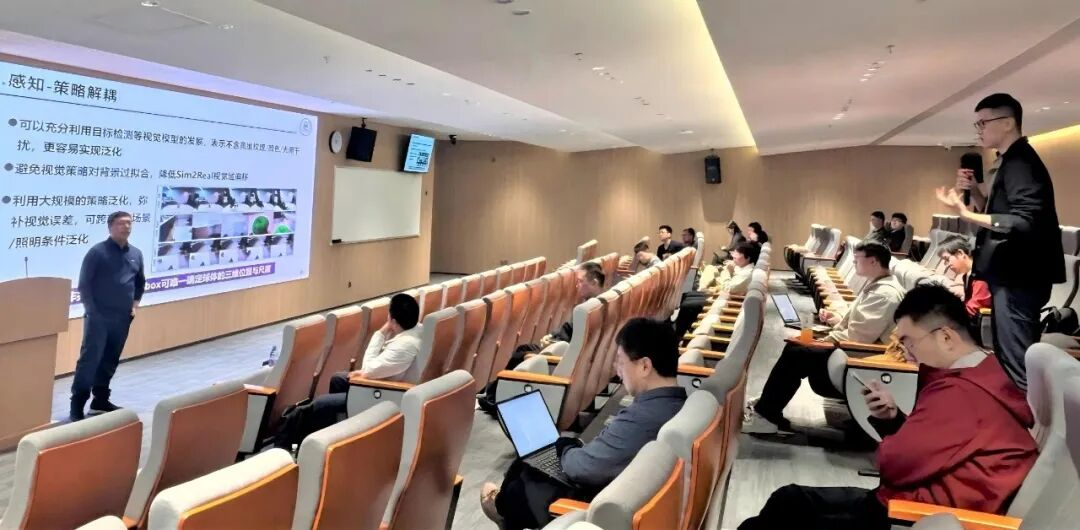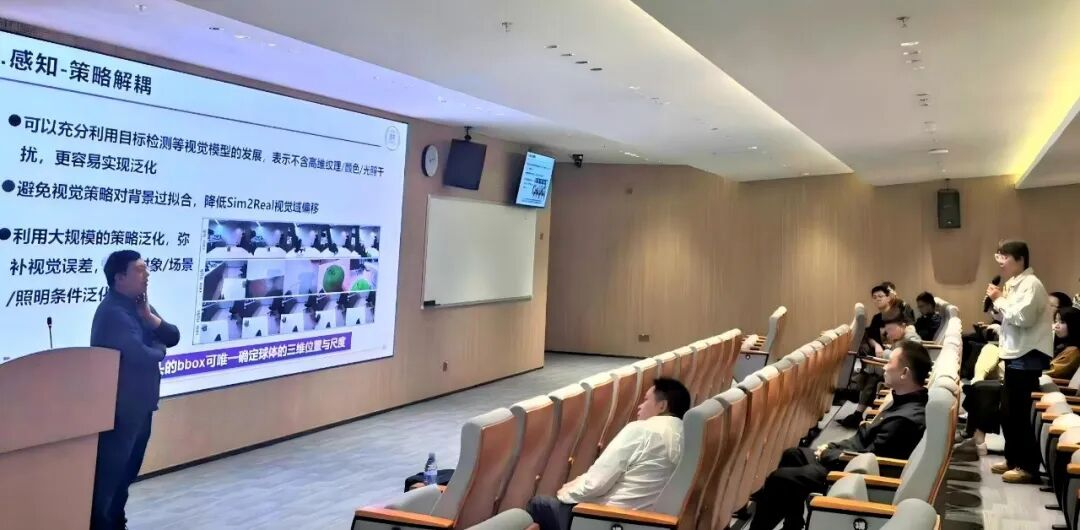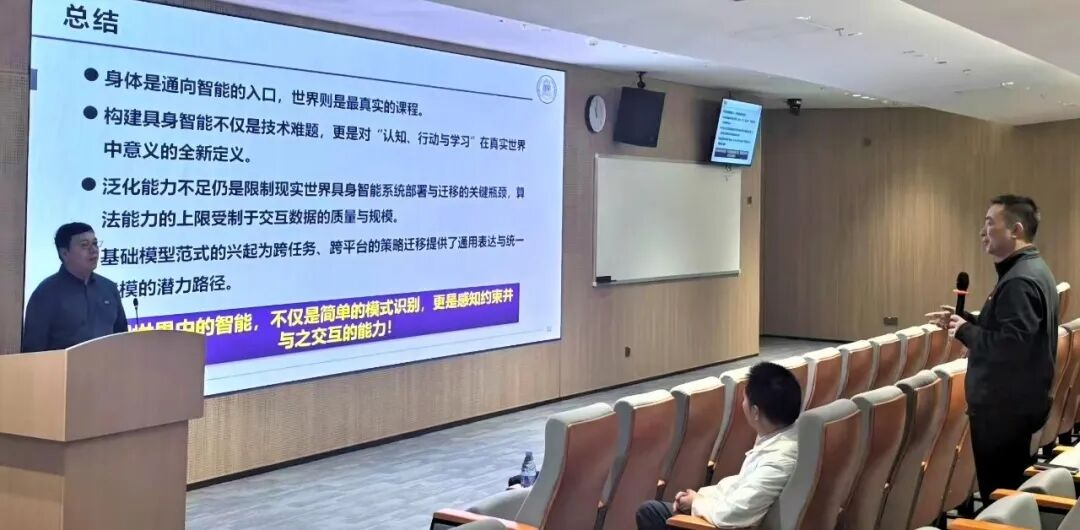 在问答环节,与会师生围绕“跨本体泛化的技术路径”、“按摩机器人等长链条任务的实现范式”、“世界模型与VLA模型的竞争与融合”、“高质量数据采集的经验原则”以及“国内开源工具生态建设”等议题与苏教授展开热烈讨论。