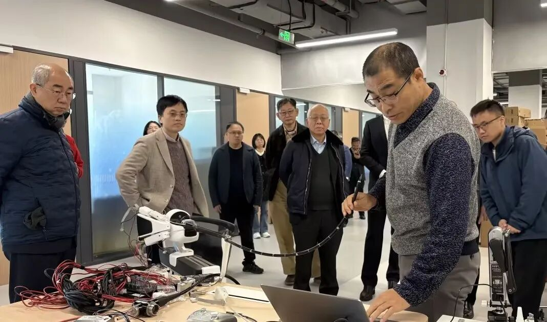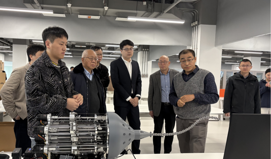 针对航空发动机、工业管道内部等极端受限空间的检测与作业难题,具身智能与计算机视觉中心任洪亮教授团队展示了其“连续体机器人具身感知与交互智能体系”研究。该研究致力于赋予机器人以极高的柔顺性与形变能力,使其能主动适应狭窄、曲折的复杂环境,实现精准导航与操作。丘成桐教授听取了团队关于在多重约束环境下实现高维路径规划、环境交互建模及自主控制策略的汇报,观看了机器人在模拟极端环境中的作业演示。