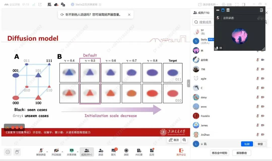 讲座现场、线上参与氛围踊跃,参与人数近两百人。问答环节讨论十分热烈,与会师生围绕凝聚现象与优化器/归一化方法的关系、初始化大小与训练速度的权衡、推理能力的不同层次(单步推理与链式思维推理)以及“统计结构如何驱动词向量嵌入学习”等问题展开深入交流。