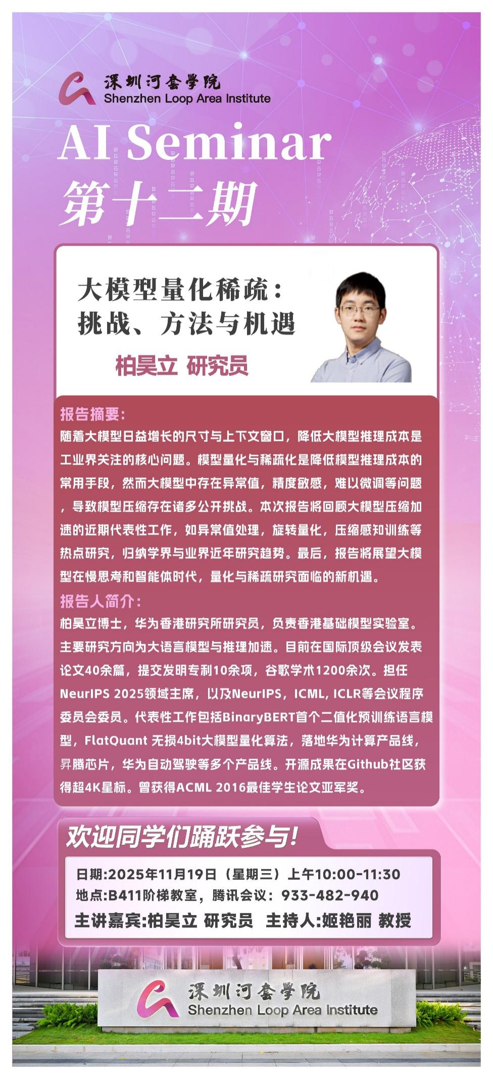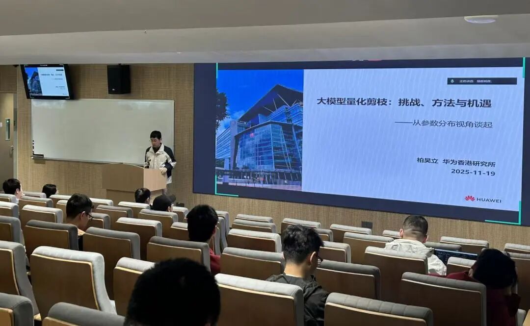 11月19日(星期三)上午,华为香港研究所柏昊立博士受深圳河套学院邀请,在B411阶梯教室开展学术报告讲座。本次讲座由姬艳丽教授主持,柏博士以“大模型量化稀疏:挑战、方法与机遇”为题,从工业界亟待解决的推理成本瓶颈切入,深度拆解了参数分布中“异常值”的处理难题。
