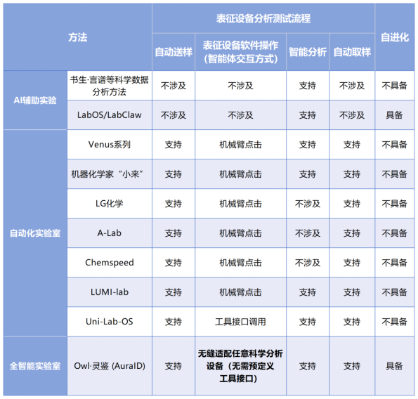 表1:不同科研实验智能系统在科研实验流程覆盖能力、自定义交互方式适配能力及自进化能力方面的对比。Owl·灵鉴可在无需预定义工具接口的条件下适配任意科学分析设备,并具备自进化能力。