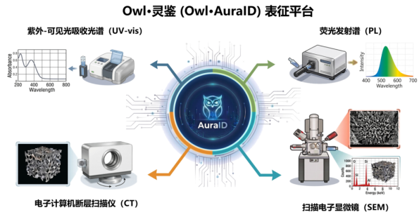 图1:Owl·灵鉴(AuraID)系统通过智能化控制中心、科学具身多智能体与自动化表征平台的协同联动,实现从仪器操作、数据采集到智能分析与报告生成的全流程科研闭环。