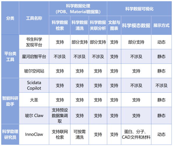 表2:不同科研智能工具能力对比。InnoClaw面向科研场景实现多源科学数据的动态处理与智能分析,增强复杂科研任务中的数据理解与辅助决策能力。